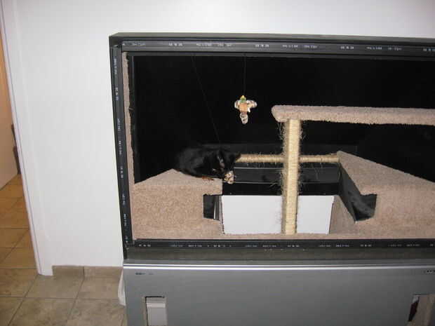 Atornillado con los tornillos de ojo en la parte superior del criadero en la parte ocupada por la plataforma alta. Tuve la suerte de que agujeros ya estaban allí desde componentes quité. Si no tienes estos huecos que debe perforarlos. Una vez los tornillos de ojo Haz algún gato juguetes con una cuerda elástica. Me corte las cuerdas de varias longitudes y había atado a los tornillos de ojo. Esto permite a los felinos jugar en varios niveles diferentes. Después de que los juguetes son en lugar de la caída de la cubierta posterior en es las varillas de soporte y luego fíjelo con los tornillos originales. Con que complemento el frente superior e inferior paneles en su lugar en el criadero. Ahora estás listo para ver a los felinos retozar y jugar. Los cinco de nosotros utilizan en distintos grados.