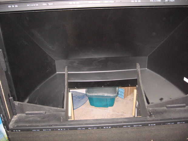 La primera imagen muestra el interior de la estructura superior de la TV. Los dos puntos en la parte posterior son 3/4" de ancho y 2" de largo. Van a ser una clave para apoyar estantes de gato, así que quería reforzarlas. Medí la distancia entre los puntos como 22". Yo cortado uno de los bloques de montaje grandes que se me quitan de la estructura superior anterior. Luego perforar agujeros piloto en los puntos e instala el bloque de montaje con tornillos para madera. Esto añade una gran rigidez a la estructura.