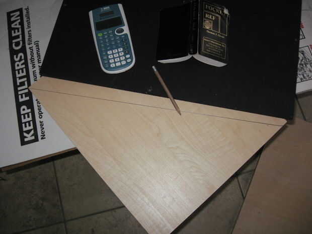 Ahora que necesitaba para cortar los estantes triangulares. Me ha pasado a tener dos piezas de madera de desecho que tenía las mismas dimensiones de la base y la altura que tendrían mis estanterías triangulares. Yo no podía recordar la fórmula para determinar la hipotenusa de un triángulo como mi glándula de matemáticas ha sido atrofiada de años de desuso. Así busqué, realiza el cálculo y había marcada la línea con una regla. Fue en este momento que me di cuenta que ya mi madera ya tenía las dimensiones adecuadas para la base y la altura que no necesito para calcular la hipotenusa a todos. Simplemente tuve que trazar una línea entre las dos esquinas y la longitud realmente no importaba. Así que puedo decir había desperdiciado 5 minutos, pero yo prefiero pensar como una confirmación de que un principio matemático que ha sido conocido por miles de años era aplicable dentro de los límites de mi sótano. Luego cortar los triángulos de los pedazos de madera y aseguradas en su lugar utilizando los tornillos de cabeza avellanados.