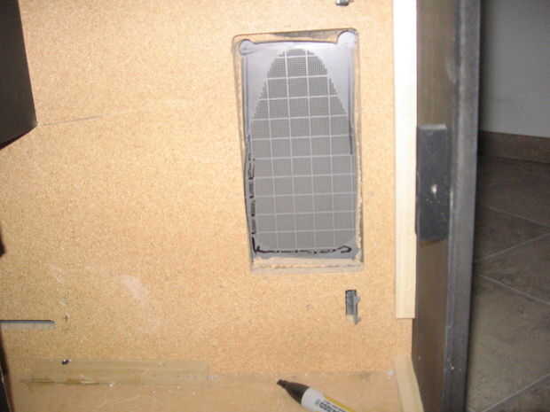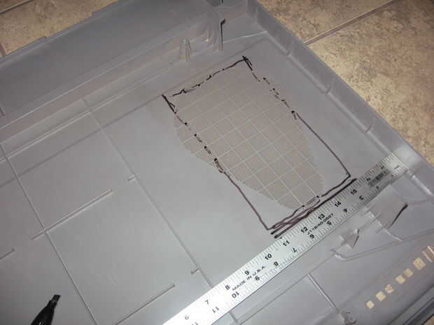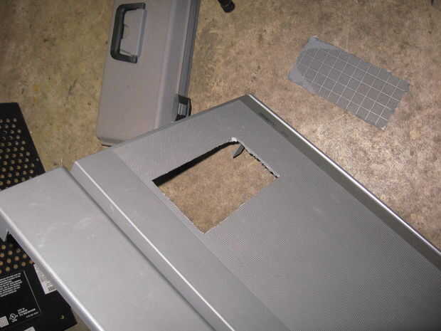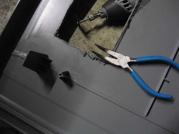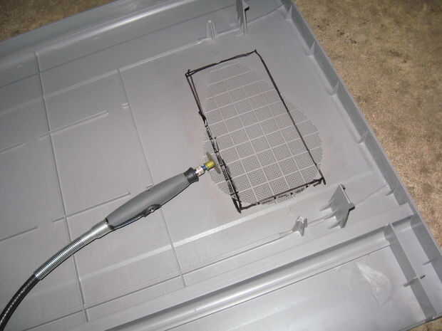 Con las líneas rectas dibujadas usé mi Dremel equipada con un disco abrasivo resistente para hacer los agujeros necesarios. Usé los alicates doblados de la nariz para desprenderla de los desechos plásticos que acumulado a lo largo de las líneas de corte. Luego puse el panel inferior en el lugar para verificar que los agujeros fueron alineados.