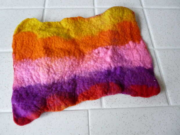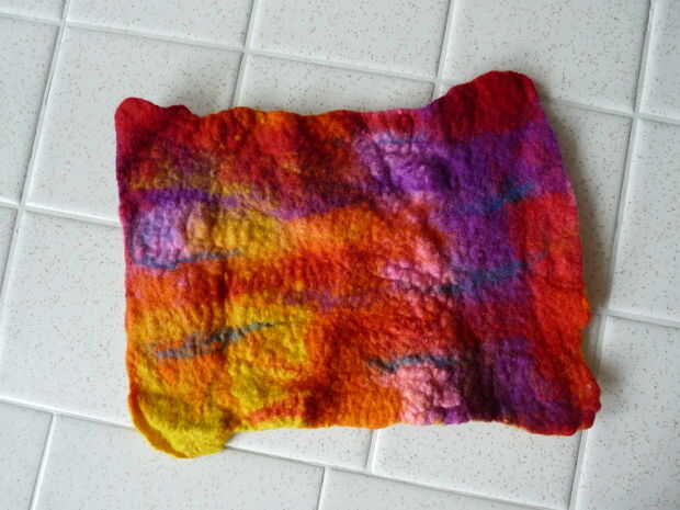 Nota: lavar y secar mi pedazo de fieltro para hacer extra grueso. Puede hacer esto con un vestido de lana viejo así y cortarlo después de la contracción. Es posible que un segundo lavado para apretar los bordes. Usar agua muy caliente. Usando telas más delgadas le dará un largo, fluyendo el arco.
