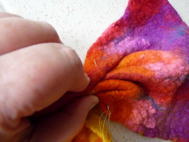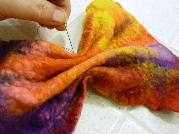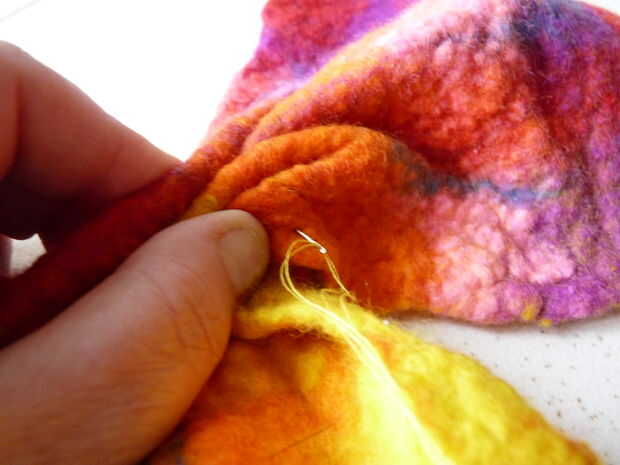 Ejecutar unas puntadas a través del mismo punto por lo que es seguro, luego anudar el hilo en la parte posterior. Mi fieltro era tan espesa que tenía que hacer unos 8 pases para asegurar la costura.