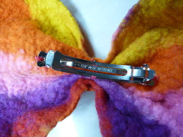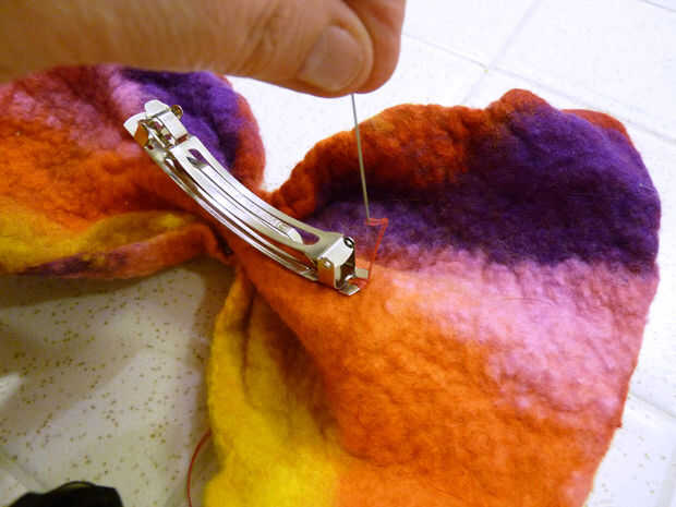 Doble un pedazo largo de hilo fuerte que coincida con su arco y el hilo de la aguja. Garantizar este hilo a un extremo de la horquilla (viene con los agujeros para ello). Vaya alrededor del agujero de metal un par de veces. Luego ponga el pasador donde te gustaría ir en la parte posterior del arco y coser una puntada desde la parte trasera a la parte delantera de la proa. Ahora vuelve a través de la tela del arco a la parte de atrás empujando la aguja a través de sólo 1-2 mm de la salida de hilo. ¡ Vaya alrededor de y alrededor del metal porque esto se mostrará en la parte delantera! Por lo tanto, va como esto: