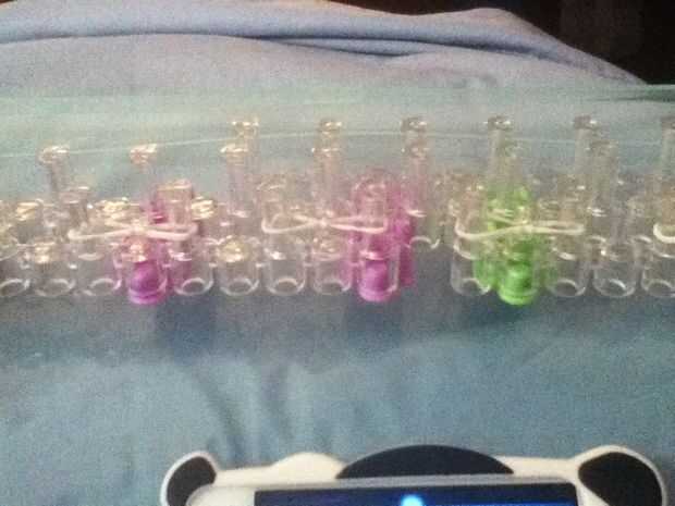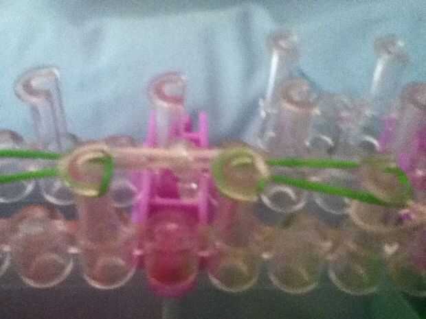 Paso 1: Obtener las herramientas Necesita su telar del arco iris, 2 colores de bandas de goma, un clip de c y un gancho.Paso 2: a partir de Una banda de goma en los dos pasadores de la torcedura. Y hacerlo otra vez con otra banda elástica.Paso 3:Gire