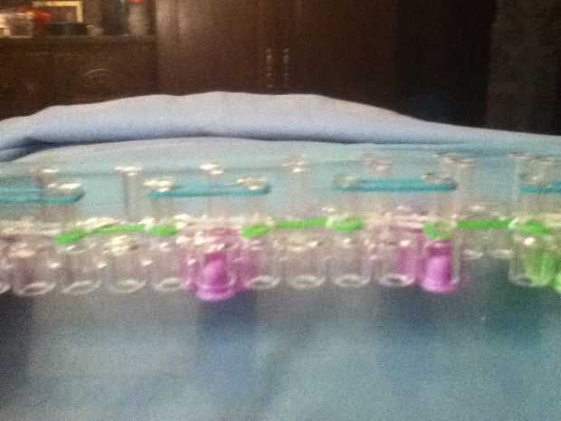 Aquí es como luce la pulsera de dragón escala. Esto es una pulsera de 8 peg. Yo estoy mostrando es una pulsera de 6 peg. Usted puede hacer que sea 4,6,8,10 y 12 clavijas de largo.Paso 1: Los artículos que necesitará Se necesita:telar del arco 1 iris1