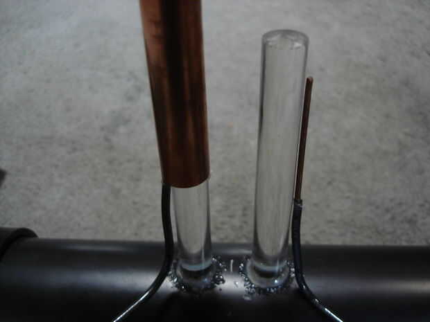 Los cables de cobre junto a las barras de acrílico y el tubo de cobre sobre ellos. Desea un firme ajuste, pero podría tener que cortar una pequeña ranura en el lado de cada varilla para que se ajuste.