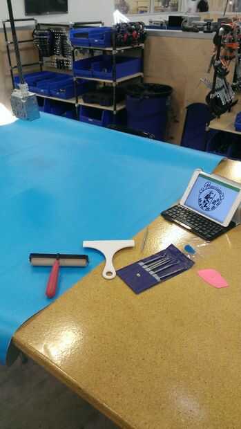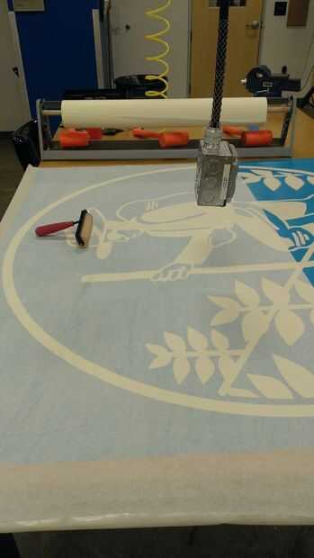 I utiliza el rodillo pequeño para expulsar cualquier burbuja de aire y aplica el papel de transferencia para cubrir la plantilla entera y luego utiliza el rodillo pequeño para asegurarse de que el papel de transferencia se adhirió a la plantilla completamente.