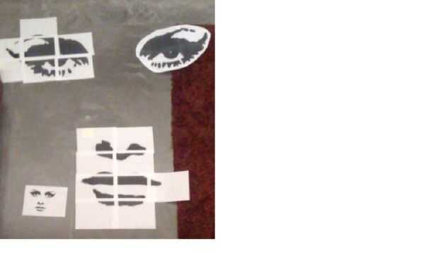 A continuación, cortar los márgenes de las páginas impresas y pegadas juntas cada página relacionada.  Básicamente existen 3 secciones a esta imagen, 2 ojos y la nariz/boca. En la foto de este paso, verás que he dejado un borde alrededor de los ojos con cinta arriba, esto viene muy bien en el siguiente paso.