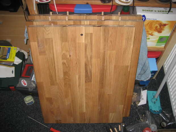 Opcional: tuve que hacen posible que el escritorio de estar nivelada. Mi piso es muy viejo y por consiguiente lejos de nivel. Así que aproveché unos pequeños pies de otro armario de Ikea, perforar los agujeros en la parte inferior de las tres patas (diámetro 14 mm, 10 mm de profundidad). Luego perforé un agujero más profundo, más pequeño (10 mm de ancho, 80 mm de profundidad). En la parte ancha de los orificios ponemos tuercas M8 con un poco de pegamento. Ahora tienes pies de nivelación muy simples a su escritorio. Si no tienes esos pies presente, usted puede comprar para cerca de 20-25 céntimos de euro un pedazo en Ikea.