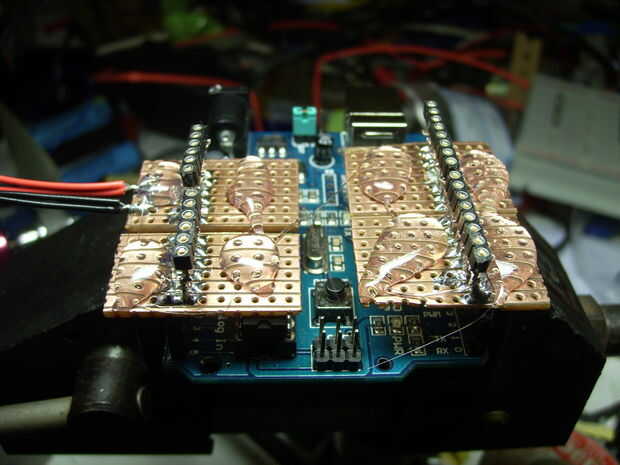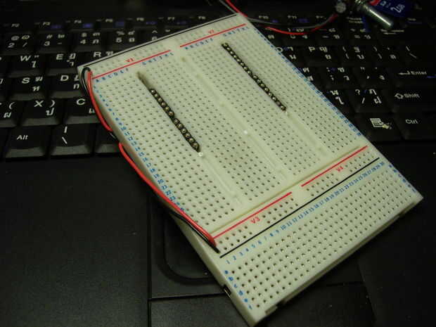 Después de que el pegamento ha fijado corta los cables de alimentación y conecte a la orilla de los carriles de alimentación de placas prototipos. Recuerde que algunos de los carriles de la energía no seguir a través de todo el tablero.