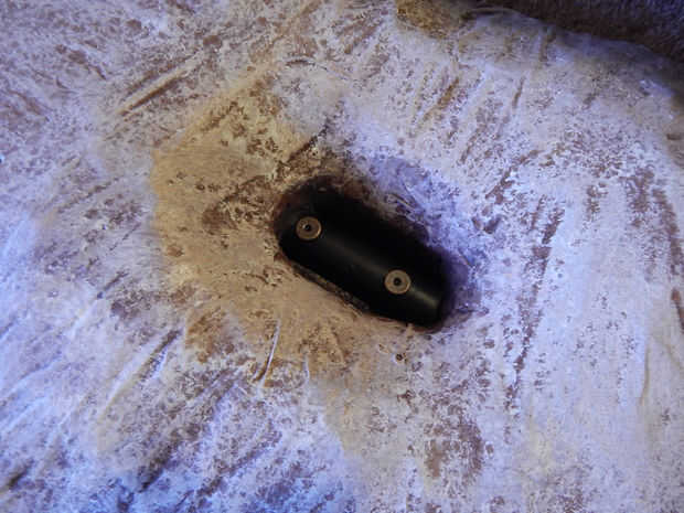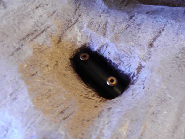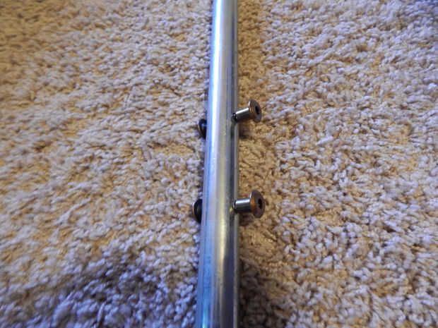 Asegurar el mango a la hoja se realiza mediante el uso de 2 conjuntos de tornillo decorativos Chicago. Éstos trabajan muy bien y son fáciles de quitar para desmontaje a mano. Inserte el mango con el acero en la hoja y la broca a través del tubo que se puede ver en el agujero de la hoja. Esto es donde las 2 piezas se unirán para una conexión más fuerte.