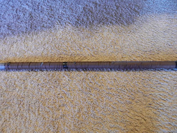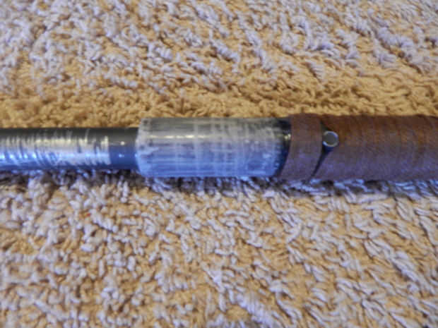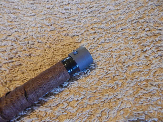 El mango entero fue pintado en gris oscuro y envuelto con tela marrón. Cinta aislante se utilizó para fijar los extremos de la tela rollos. Había atado las tiras de cuero para ocultar la cinta, pero los que rápidamente se desataban durante la Convención.