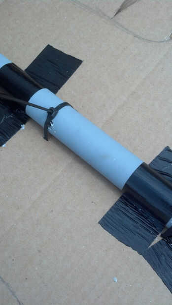 Se perforaron agujeros (1/4") en el PVC para que la espuma podría ampliarse en el soporte. Uno en el extremo de la empuñadura fue utilizado para un alambre para colgar la hoja durante los pasos futuros.