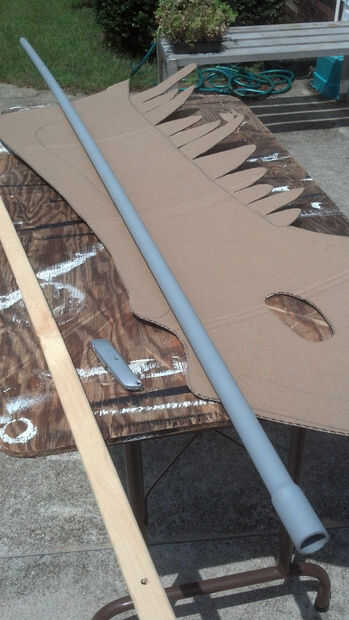 Elegí la longitud estándar de 10 pies, 1 pulgada de diámetro, schedule 40 PVC eléctrico conducto para el mango y el soporte. Este grado tiene una fuerza más dúctil que el PVC normal permitiendo a flexión bajo tensión sin agrietarse. El conducto eléctrico 40 de horario usé ha moldeado puntos de conexión en el extremo. Esta conexión se pegue hacia fuera de la empuñadura para insertar el resto de la PVC en el soporte para usar como mango. Se redujo el apoyo a la articulación moldeado justo debajo de la empuñadura y el extremo opuesto ante el filo de la espada. Usted quiere asegurarse de que no sea de la forma cuando se talla la espuma en el borde.