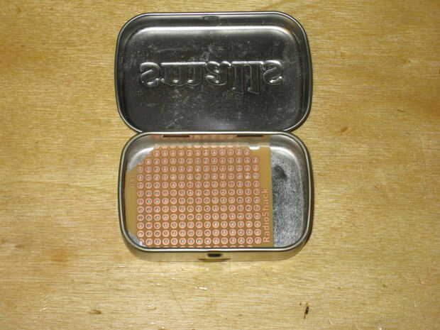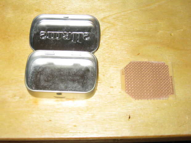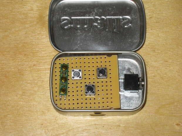Ahora podemos colocar los componentes y ver cómo encajan en la lata. Asegúrese de que tener suficiente espacio para que el jack estéreo de 1/8" para adaptarse. Cuando hacemos el montaje final de la Junta serán levantado para arriba desde la parte inferior de la lata para que los botones pueden sobresalir por la parte superior.