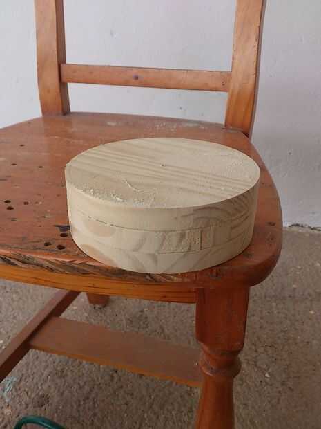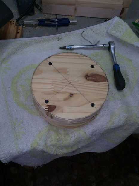 Antes de empezar a lijar que queremos atornillar la pieza inferior al anillo, eso hará que el lijado más fácil. He marcado 4 puntos a 1,5 Cm del borde e inserta los tornillos.