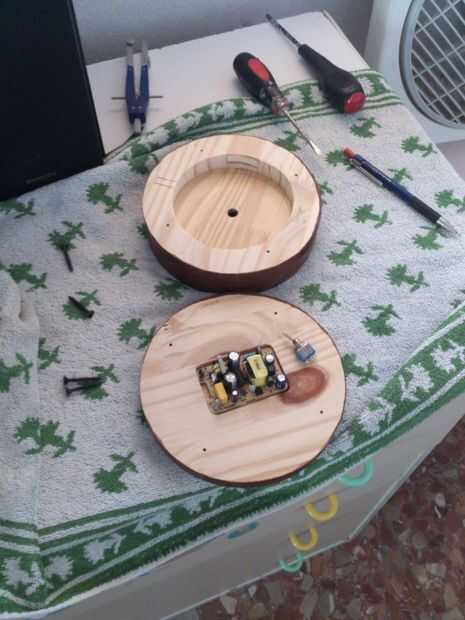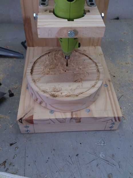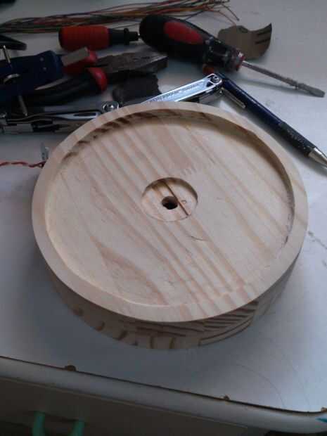 Después se lija en los bordes, hago una depresión con el tamaño de la base de la botella, esto permitirá que la botella encajar en y hará más difícil caer si alguien golpea accidentalmente. Con el compás traza el círculo y con mi taladro casero y un poco de talla hueco que parte de unos 0,6 mm.