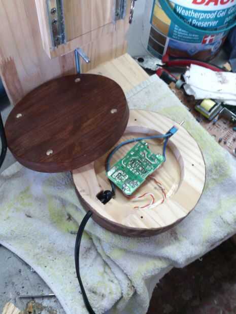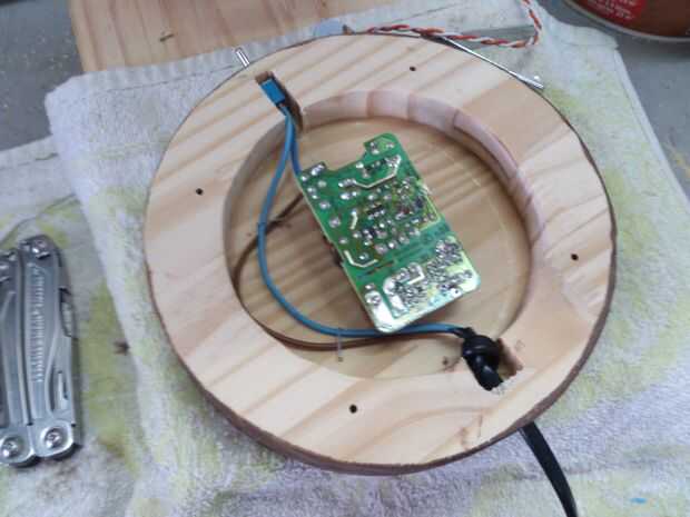 Después de esto que conectar el vivo y el neutro a los correspondientes lugares en la alimentación, pero con un interruptor de palanca entre uno de los cables, lo mismo se aplica para los cables positivos y negativos para el módulo de LED, mantenga los cables en su lugar con algunas grapas, no quiero tener los cables de alta tensión moviendo alrededor.