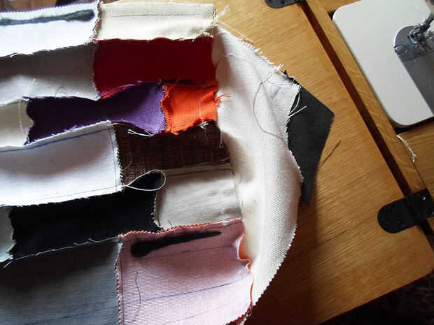 Ahora se hace la pieza de punta y necesita a coser a uno de los lados cortos de los retazos de tela que hiciste antes de.