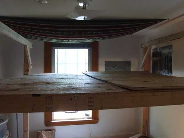 De todos modos, hemos luchado la madera contrachapada mis escaleras y en mi apartamento. La sala en que estoy poniendo el loft es exactamente del tamaño del Palomar, por lo que la madera contrachapada en el desván fue duro. Acabé teniendo uno de los soportes de piso, y discuten hasta por el interior del desván.