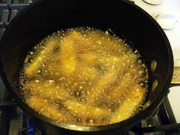 Soltar las piezas recubiertas suavemente en el aceite caliente