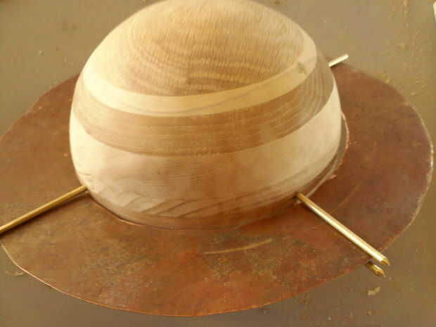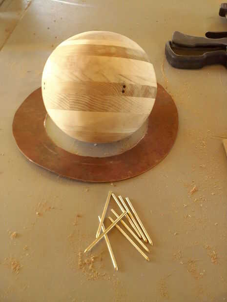 Anillos de Saturno he utilizado vieja, manchada hoja de cobre. Corte los anillos con un par de tijeras y lija los bordes con una dremel. Usando un taladro perforé 8 1/8" agujeros alrededor de la mitad de la esfera. Corte y lija en una barra de cobre amarillo gruesa de 1/8" para hacer alfileres para sostener los anillos en su lugar.