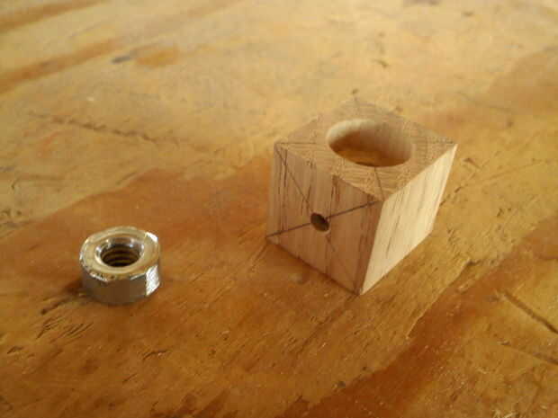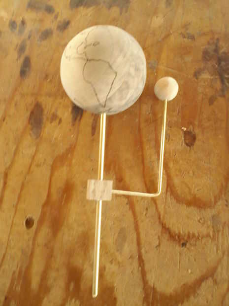 Sistema de la luna es esencialmente una versión en miniatura del resto del sistema giratorio. La luna gira en una tuerca hexagonal pegado en la barra vertical de la tierra y arena suave. El bloque giratorio es ~ 1 "x 1" x 1" con un empotrado orificio de 0.5" que descansa en la tuerca hexagonal. Usé una barra de latón de 1/8" doblado en un ángulo de 90 grados para la barra horizontal o vertical. Debido a su tamaño pequeño he elegido no a contrapeso la luna (que luego tendría que contrapeso contrapeso en el otro lado de la lámpara).
