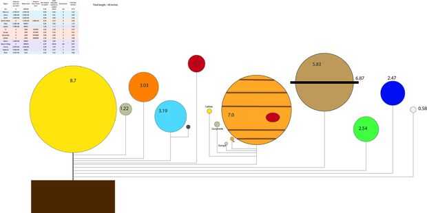 Los cálculos a continuación no incluyen a Eris. Informes varían en cuanto a si en realidad es significativamente más grande que Pluto o sólo ligeramente más grande. Elegí el menor valor para el radio ya que es el más reciente. Todos los datos son de la Nasa. La escala se calculó en excel y modelado en photoshop.