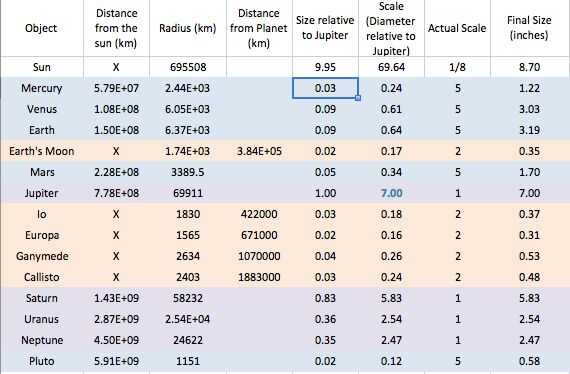 I establecer tamaño de Júpiter en 7 pulgadas (diámetro) y escala de los planetas en relación con él. Ser consciente de que siete pulgadas es mucho mayor de lo que suena y mucho más pesado de lo que piensa (pesos de Júpiter ~ 3 lbs). Muchas de mis limitaciones de diseño más adelante vinieron de Júpiter y de Saturno el peso.
