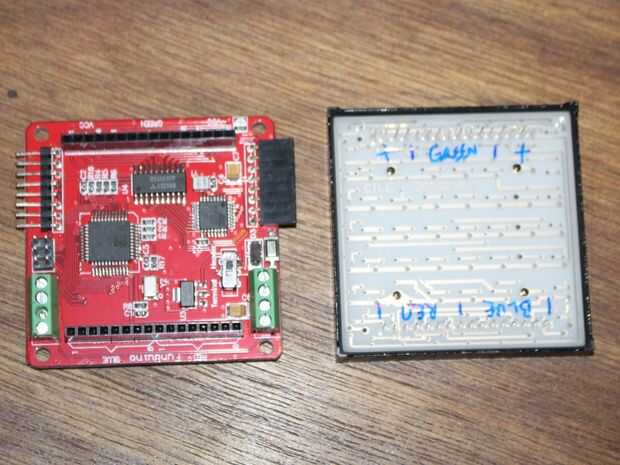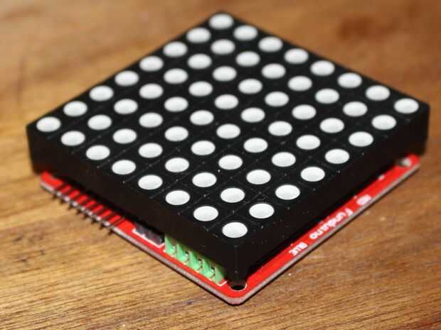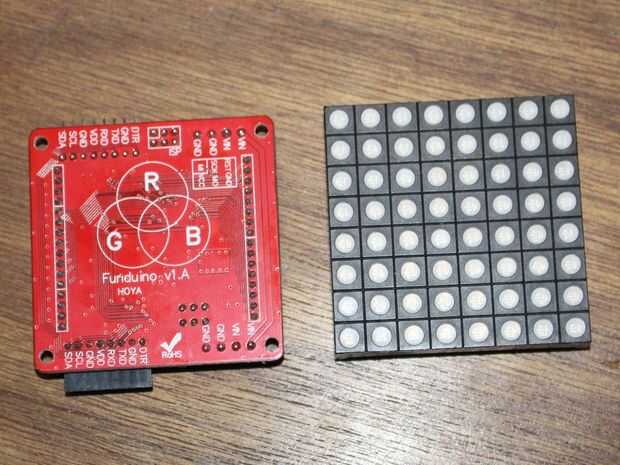 Así que el tablero original de Funduino y matriz de LED mide sólo 60 de 60 mm y es divertido probar, una vez que tengas un FTDI cable compuesto puede experimentar con el programa y probar la pantalla. La biblioteca de Colorduino escrito por Lincomatic permite definir píxeles individuales o llenar toda la pantalla con un color fijo. Visita su blog para todos los detalles.
