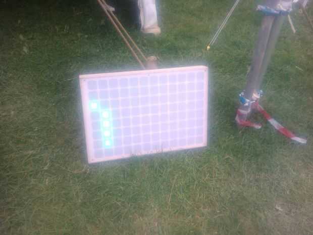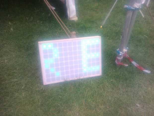 Aquí está la unidad en acción. Se ve muy bien en la noche especialmente en el campamento EMF, donde fue utilizado para anunciar los horarios de la robótica Robot cóctel que había construido un grupo en Nottingham Hackspace.