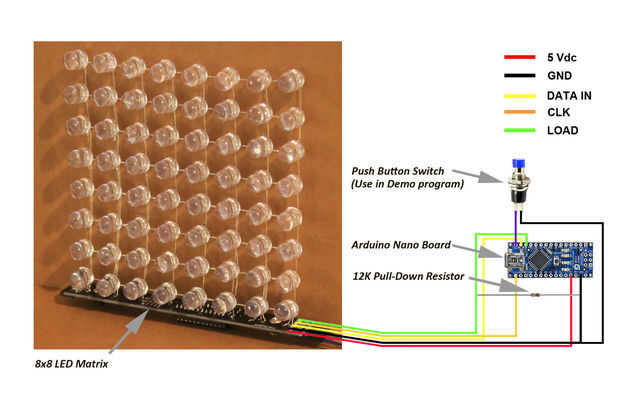 Utilizamos un Arduino Nano cargado con nuestro programa de prueba de matriz de LED para la prueba. Ver la foto de arriba para conectar el Arduino Nano a la matriz de LED PCB. Descargar el programa de prueba a continuación y proceder con la prueba. Usted debe ver que las filas de la matriz LED encendido fila por fila a partir de la fila superior. La prueba es repetida después de que se encienden todas las filas.