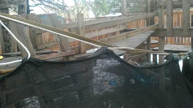 a continuación, coser la banda en la red dejando vacíos así que usted puede pase la cuerda a través de la banda para la red. Cosa mucho para reforzar el vínculo entre la red y la correa. Si puedes ponen los agujeros en la lona o utilizar los existentes, la lona se rasgan. Utilizando fleje reforzado espacios para cuerda elimina este problema.