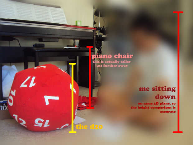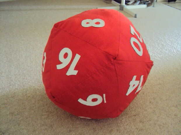 Aquí hay algunas fotos de un d20 peluche enorme que hice. Fue mi primer proyecto de costura por lo que si pude hacerlo, cualquiera puede. Para una indicación del tamaño, ver la tercera foto.