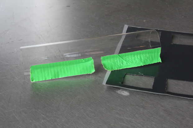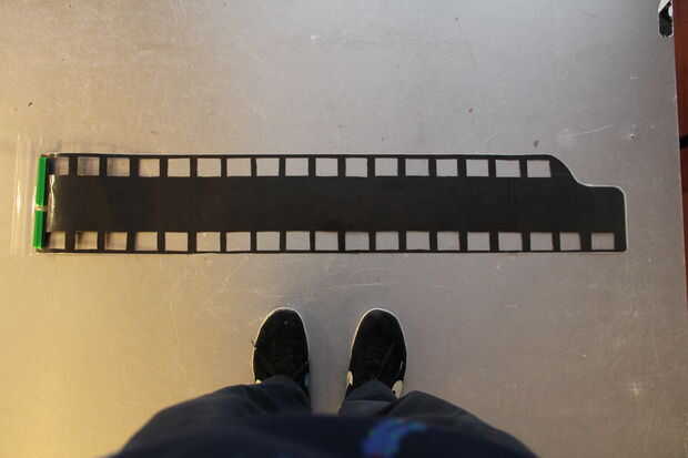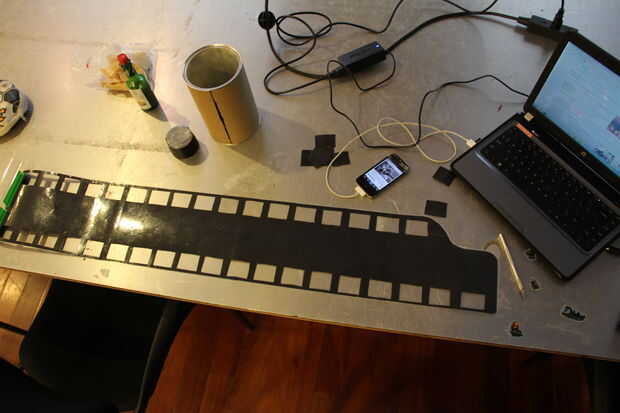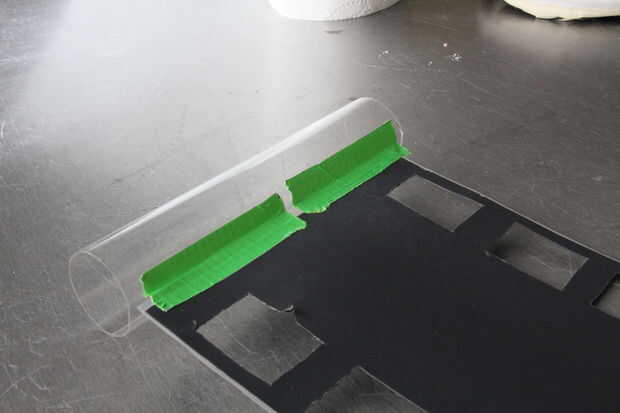 Una vez que termines cortando los agujeros de piñón, coge la varilla del cilindro de plástico de 9 pulgadas y conducto de cinta adhesiva en el extremo plano de su rollo de película. Asegúrese de que el espacio sobrante del cilindro está en la parte superior del rollo. Ver fotos para más detalles.