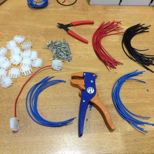 El StripDrivers use conectores grandes y tienen rastros de alimentación amplia, doble-para arriba de modo que el poder completo de la matriz puede pasar a través de los primeros pocos módulos. Esto simplifica el cableado un poco, eliminando la necesidad de demasiados grifos de alimentación de cadena media. Para las tiras de 16, no tenía que añadir cualquier grifería de potencia extra. Necesitamos hacer algunos poder personalizado y cables de comunicación. Después de medir y cortar todos los cables necesarios, nos desnudaron los extremos para preparar para prensar los conectores. Este separador automático hace el trabajo mucho más fácil.