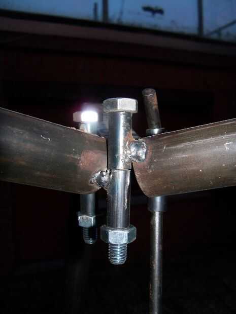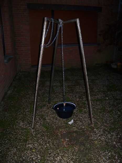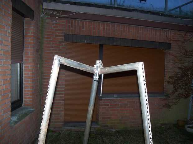 A continuación os pongo mis dos tornillos en los tubos superiores y luego a través de los más bajas de la próxima etapa. Luego poner las tuercas en y atornillados todos juntos. No tiene que ser apretado, porque todavía quiero ser capaz de doblar mi trípode juntos. Puse un trozo de redondo de acero que tenía una curva en un extremo en el último par de tubos, por lo que sería más fácil desarmar todo cuando tengo que poner el trípode lejos. El gancho está en el extremo de la cadena. Ahora guardo la cadena resbale hacia abajo envolviendo alrededor de uno de los pernos o el hierro redondo como usted lo haría con una cuerda en una cala, pero estoy pensando en arreglar una llanta pequeña de una bicicleta de los niños a una de las piernas como una polea que atropellar la cadena. Vamos a ver si es necesario.
