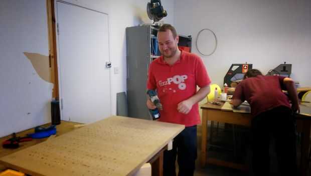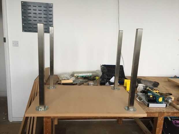 Para las patas usamos unos de acero de Ikea que teníamos en nuestra sala de donación, pero la madera sería posible. Esta cosa es pesado así que dependen de tornillos para sostener que las piernas que los atornillados sobre el uso de Tnuts. También desea reforzar el cuadro, la presión de aire actúa sobre la parte de afuera de este cuadro quiere desviar la tabla y hacer cóncavo. Sin embargo usted decide reforzar la mesa Asegúrese sus refuerzos no se restrinja el flujo de aire demasiado, hemos perforado agujeros de 75mm en el nuestro.