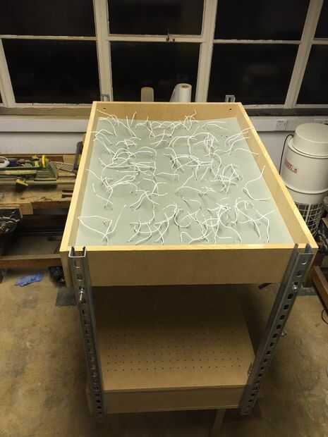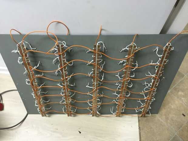 Nos enfrentamos entonces la pesadilla de 70 portalámparas, 2 cables de cada uno que deban ser conectado junto. todo, desde bloques de terminales para soldar los alambres entre sí era considerado pero al final decidimos hacer un PCB básico. Debido al tamaño del PCB hemos podido grabar en la casa y las empresas generalmente probaron demasiado costosas. Al final nosotros manualmente les muelen.