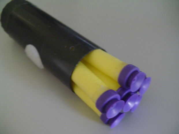 Usted puede cargar a seis stefans, o 5-6 Nerf dardos. HIGHLEY sugiero usar stefans, dardos regulares mata a la gama por cerca de 10 pies. No ha sido probado con micro dardos o líneas, sin embargo.