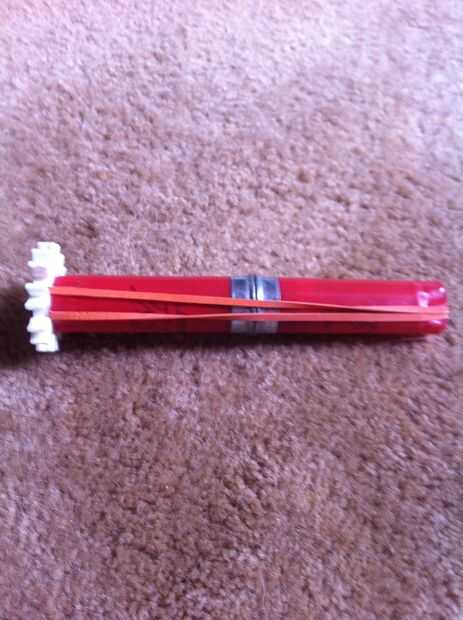 esta es mi bomba doble KVG. es potente y fácil de hacer.conteo de piezas:dos pernos de barras amarillos4 conectores naranjados barras verdes12 separadores gris4 pequeñas bandas de cauchoy eso es una bomba doble de KVG!