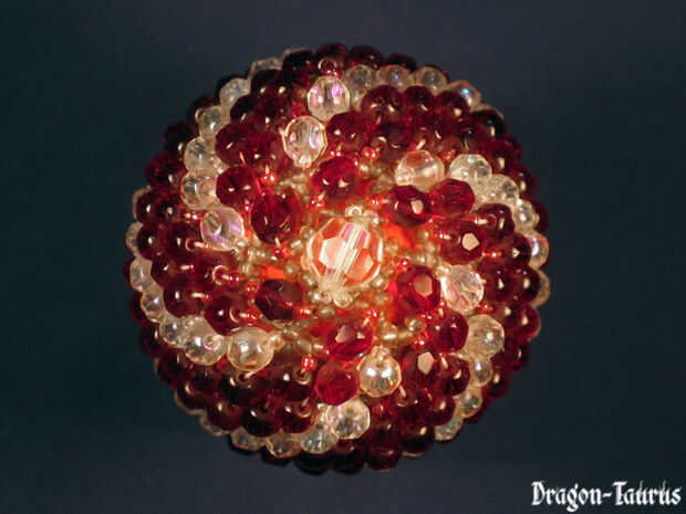 no se ve exactamente igual que Granada, pero la combinación de brillante color roja y blanca me hizo nombrar así este trabajo. Vistas de frente, primer plano, superior e inferior. Cuentas checas en base de madera torneada y pintado
