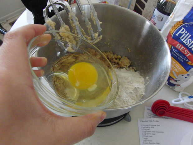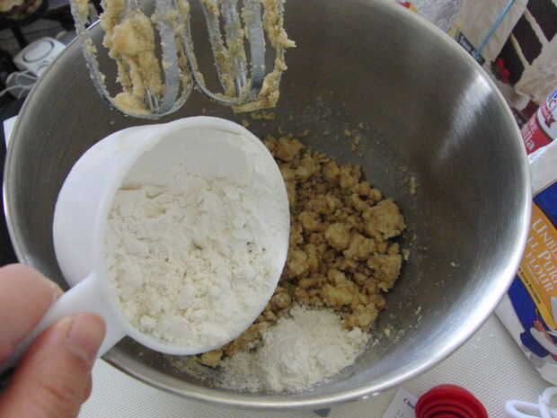 Después de la mezcla se parece a una migaja, agregar las 2 tazas de harina para todo uso, junto con la sal y el polvo de hornear. Batir a velocidad media unos 2 minutos PR justo hasta que la mezcla empieza a agrupar un poco. Añadir el huevo, la vainilla y el chocolate a la mezcla así.