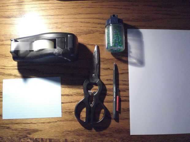 cinta 1 2 tarjeta de nota (cualquier tamaño) 3 tijeras 4.a la pluma 5.a fire cracker (o fuegos artificiales pequeños) 6 aire suave BB 7 y una hoja de papel de impresora normal