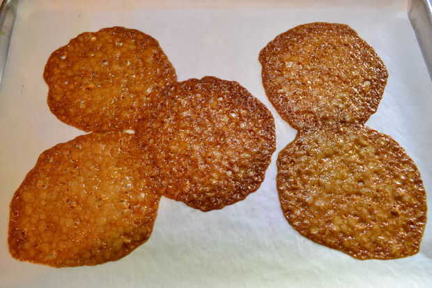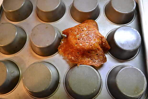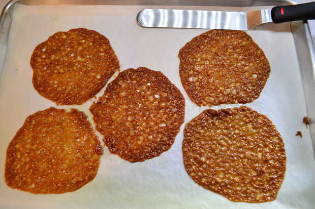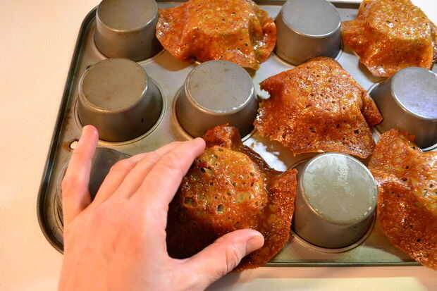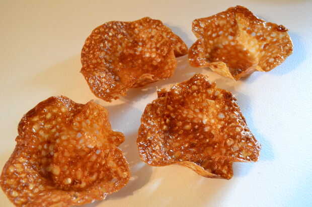 La cesta de azúcar habrá extendido y algunos pueden se han unido. Usando una espátula de metal, corte cualquier lugar donde unen para separarlas. Permita que se enfríe unos 15-30 segundos. No se fijase. Tan pronto como usted puede manejarlos (cuidadoso, que va ser caliente!), empezar a recoger con una espátula de metal e invertir en la parte posterior de una bandeja de muffins o tazas de café boca abajo. Con la mano, presione ligeramente a forma alrededor de la lata del mollete (o taza). Deje que se enfríe completamente.