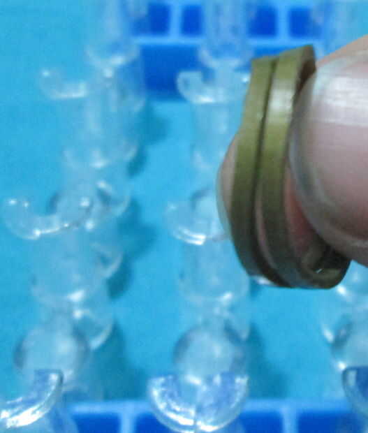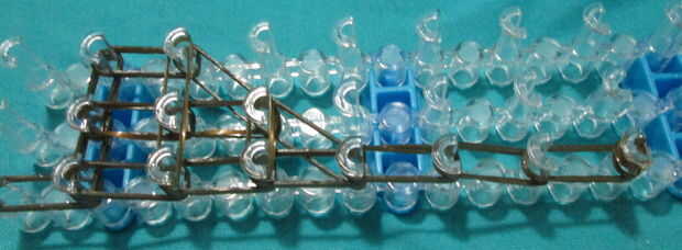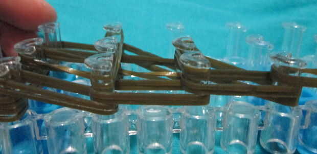 Ahora está listo para enganchar. Siga las flechas púrpura en el patrón en el paso anterior (el patrón en el lado derecho). Al llegar al final, deslice el gancho a través de las dos bandas finales (cuatro bucles) en A3 y retire del telar. Ahora tienes una mitad de un bigote maravilloso! (ver imagen)