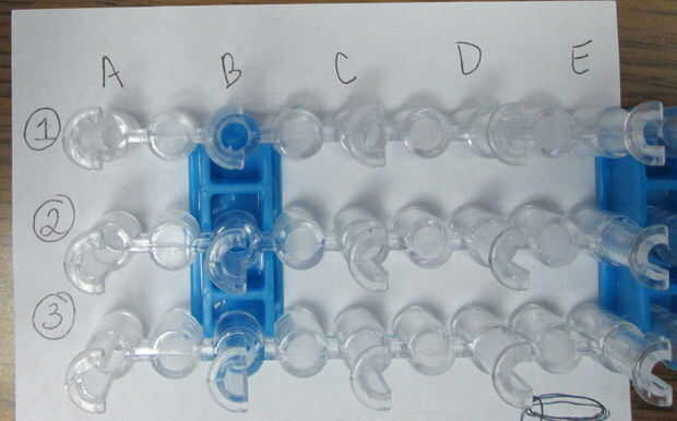 Tenga en cuenta el estilo de cuadrícula de etiquetado para las clavijas. En un intento de evitar confusiones, voy a referirme a las clavijas por estos indicadores de la red (por ejemplo A1 es la peg en la esquina superior izquierda de la imagen).