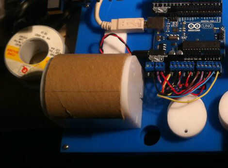 Esconde una batería 4xAAA dentro el tapón del cañón y luego ejecutarlo a través de un interruptor a GND y Vin en la ONU para alimentar el Arduino GRANDE.