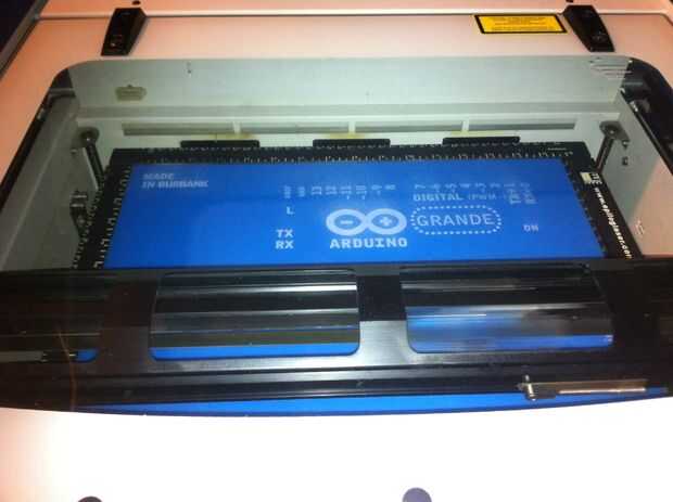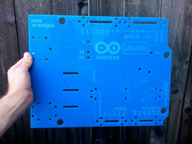 Aquí el grabado se utiliza para crear un relieve que eventualmente será pintado blanco para un look serigrafiado de PCB de alto contraste. Por favor, asegúrese de que usted tiene ventilación y buena filtración cuando acrílico de corte--como Tod Kurt una vez dijo, huele como estás quemando gasolina congelada.