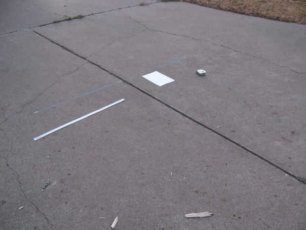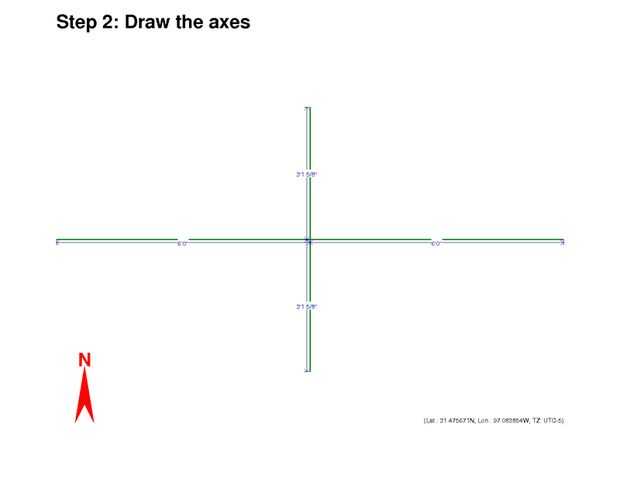 Una vez que sepa qué camino es hacia el norte, dibuja un centro punto para los dos ejes y luego trazar los ejes hacia afuera del punto central (hacia el norte, sur, este y oeste), utilizando las dimensiones que se muestra en el paso 2 del archivo PDF. Asegúrese de que con a los dos ejes en ángulo recto. Usé un pedazo de la estantería que tenía en el garaje para hacer que las cosas en ángulo recto (Foto 2).